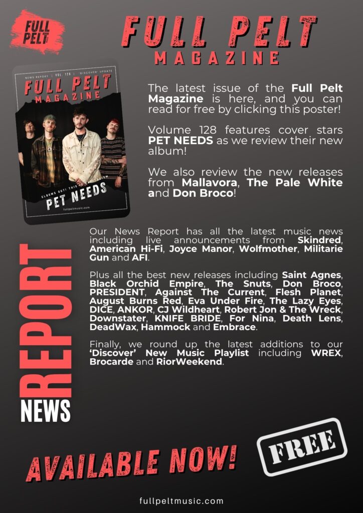 Categories Magazine Full Pelt Magazine Post author By fullpeltmusic Post date March 27, 2026 Vol. 128 Follow us on Social Media FacebookTwitterInstagramTikTokYouTube TAP THE POSTER TO READ OUR FREE MAGAZINE! Find Full Pelt Music on YouTube! Check out our two Podcasts! Tags AFI, Against The Current, Album, Album Review, American Hi-Fi, ANKOR, August Burns Red, Black Orchid Empire, Brocarde, CJ Wildheart, DeadWax, Death Lens, DICE, don broco, Downstater, Embrace, Eva Under Fire, Flesh Planet, For Nina, Full Pelt Magazine, Hammock, Joyce Manor, KNIFE BRIDE, Live Music, Mallavora, Militarie Gun, Music, Pet Needs, President, review, RiotWeekend, Robert Jon & The Wreck, Saint Agnes, Skindred, The Lazy Eyees, The Pale White, The Snuts, Tour, Wolfmother, WREX ← Mallavora → Masca