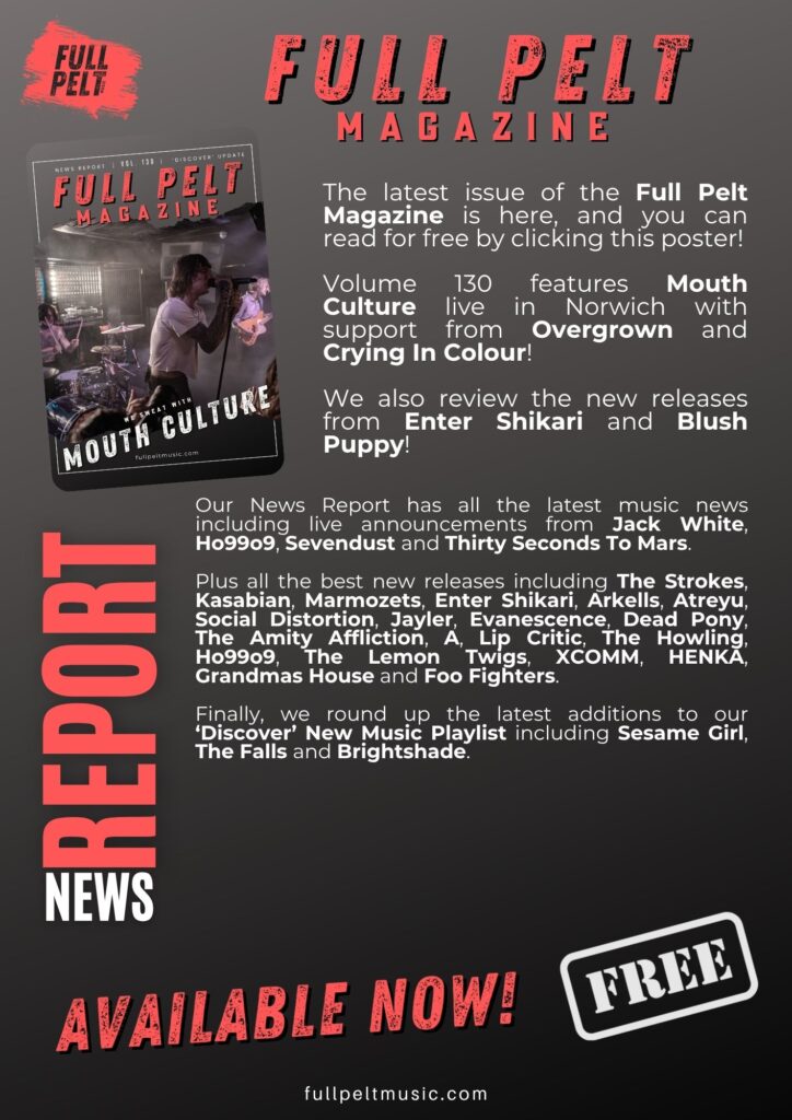 Categories Magazine Full Pelt Magazine Post author By fullpeltmusic Post date April 12, 2026 No Comments on Full Pelt Magazine Vol. 130 Follow us on Social Media FacebookTwitterInstagramTikTokYouTube TAP THE POSTER TO READ OUR FREE MAGAZINE Find Full Pelt Music on YouTube! Check out our two Podcasts! Tags A, Album, Album Review, Arkells, Atreyu, Blush Puppy, Brightshade, Crying In Colour, Dead Pony, enter shikari, Evanescence, Foo Fighters, Full Pelt Magazine, Grandmas House, HENKA, Ho99o9, Jack White, Jayler, Kasabian, Lip Critic, Live Music, Live Review, Marmozets, Mouth Culture, Music, Norwich, Overgrown, review, Sesame Girl, Sevendust, Social Distortion, The Amity Affliction, The Falls, The Howling, The Lemon Twigs, The Strokes, Thirty Seconds To Mars, Tour, Voodoo Daddy's, XCOMM ← Mouth Culture → IST IST Leave a Reply Cancel replyYour email address will not be published. Required fields are marked *Comment * Name * Email * Website Save my name, email, and website in this browser for the next time I comment. Type in the text displayed above