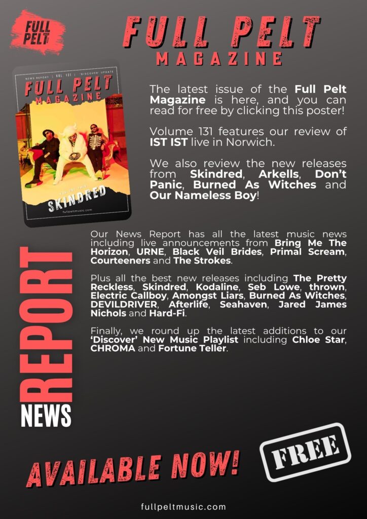 Categories Magazine Full Pelt Magazine Post author By fullpeltmusic Post date April 19, 2026 No Comments on Full Pelt Magazine Vol. 131 Follow us on Social Media FacebookTwitterInstagramTikTokYouTube TAP THE POSTER TO READ OUR FREE MAGAZINE Find Full Pelt Music on YouTube! Check out our two Podcasts! Tags Afterlife, Album, Album Review, Amongst Liars, Black Veil Brides, Bring Me The Horizon, Chloe Star, Chroma, Courteeners, DevilDriver, Electric Callboy, Fortune Teller, Full Pelt Magazine, Hard-Fi, Jared James Nichols, Kodaline, Live Music, Live Review, Music, Norwich, Primal Scream, review, Seahaven, Seb Lowe, The Pretty Reckless, The Strokes, thrown, Tour, URNE