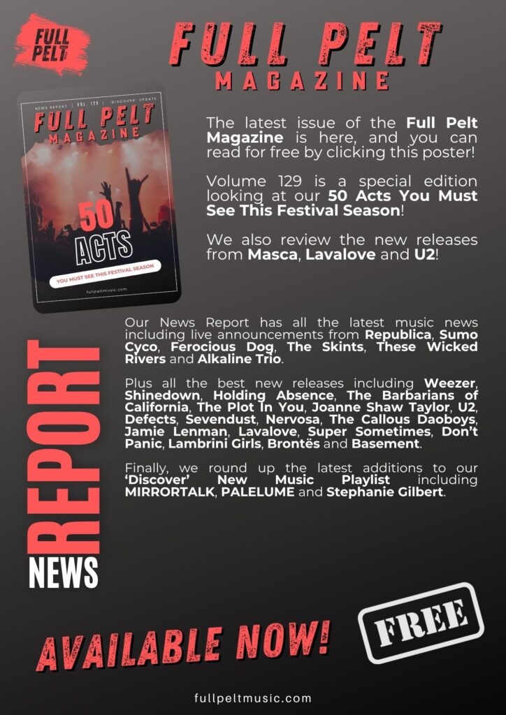 Categories Magazine Full Pelt Magazine Post author By fullpeltmusic Post date April 5, 2026 No Comments on Full Pelt Magazine Vol. 129 Follow us on Social Media FacebookTwitterInstagramTikTokYouTube TAP THE POSTER TO READ OUR FREE MAGAZINE! Find Full Pelt Music on YouTube! Check out our two Podcasts! Tags 50 Acts To See This Festival Season, Album, Album Review, Alkaline Trio, Basement, Brontes, Defects, Don't Panic, Ferocious Dog, Festival, Full Pelt Magazine, holding absence, Jamie Lenman, Joanne Shaw Taylor, Lambrini Girls, Lavalove, Live Music, Masca, MIRRORTALK, Music, Nervosa, PALELUME, Republica, review, Sevendust, Shinedown, Stephanie Gilbert, Sumo Cyco, Super Sometimes, The Barbarians of California, The Callous Daoboys, The Plot In You, The Skints, These Wicked Rivers, Tour, U2, Weezer
